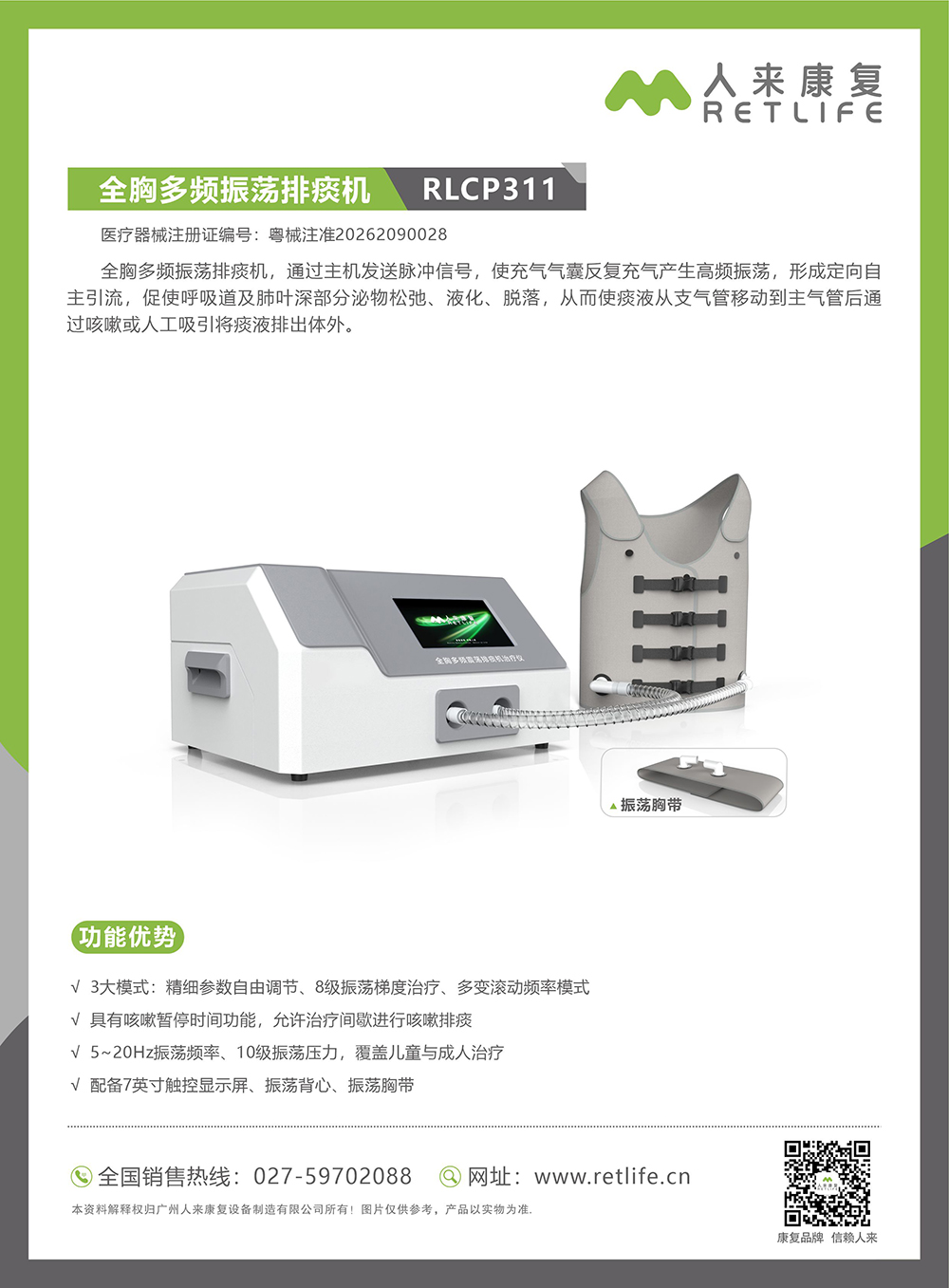The full-chest multi-frequency oscillatory sputum evacuation device sends pulse signals through the main unit, causing the inflatable air sac to inflate repeatedly and generate high-frequency oscillations, forming directional spontaneous drainage. This promotes the relaxation, liquefaction, and shedding of secretions in the deep parts of the respiratory tract and lung lobes, allowing the sputum to move from the bronchi to the main trachea and then be expelled from the body through coughing or artificial suction.