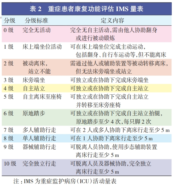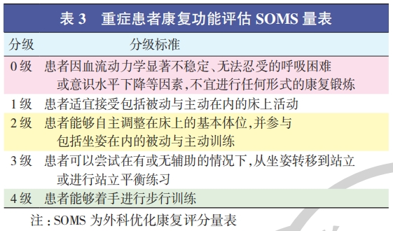 1、康复需求的评估 :针对入住 ICU 超过 1 d 的患者,应当实施康复需求的系统评估,而对患者康复状态的规范化测评和记录则是制定 ICU 初期康复计划的关键环节。目前,在评估ICU 患者康复状况时,普遍采用的量表主要包括 ICU 功能状态评分量表(functional status score for ICU,FSS-ICU)、ICU 活动量表(ICU mobility scale,IMS)和外科优化康复评分量表(surgical optimal mobility score,SOMS)。