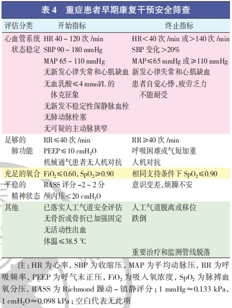 2、康复介入时机的把握 :尽管评估患者康复需求后,在病情允许的情况下需尽早开始康复治疗,然而危重患者的特点是病情重、变化快,诊疗方案的综合考量是推进治疗顺利进行的基础。目前较多从呼吸系统、循环系统、神经系统、内外科重大疾病和患者主诉等方面,综合考虑运动的安全性,作为运动干预介入和终止的评价标准。我国学者也对安全标准进行了归纳总结,最终形成了可提供内容参考和量化标准的重症早期康复干预安全筛查(表 4),以期对早期重症康复的开始和终止时机提供依据。