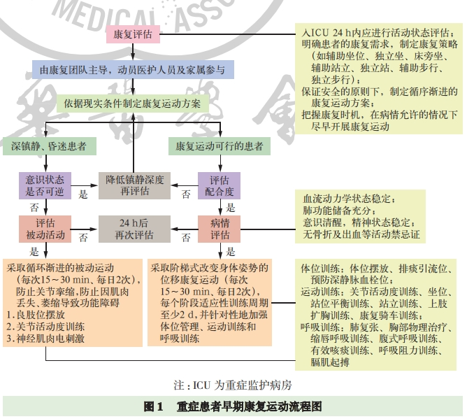 3、实施流程 :危重患者个体化治疗基于“目标与目的”“连续与动态”“治疗与再损伤”等原则,诊疗方案的综合考量是顺利推进治疗的基础。高级医师、病例讨论、多学科协作诊疗(multi-disciplinary treatment,MDT)讨论等可以提供预见性判断,制定个体化康复治疗策略,以及整体病情把控等宏观与具体治疗方案。基于现有证据归纳总结,形成由多学科共同参与的重症患者早期康复运动流程图(图 1),包括康复运动方案、康复训练的关键步骤、康复过程的监测与评估。