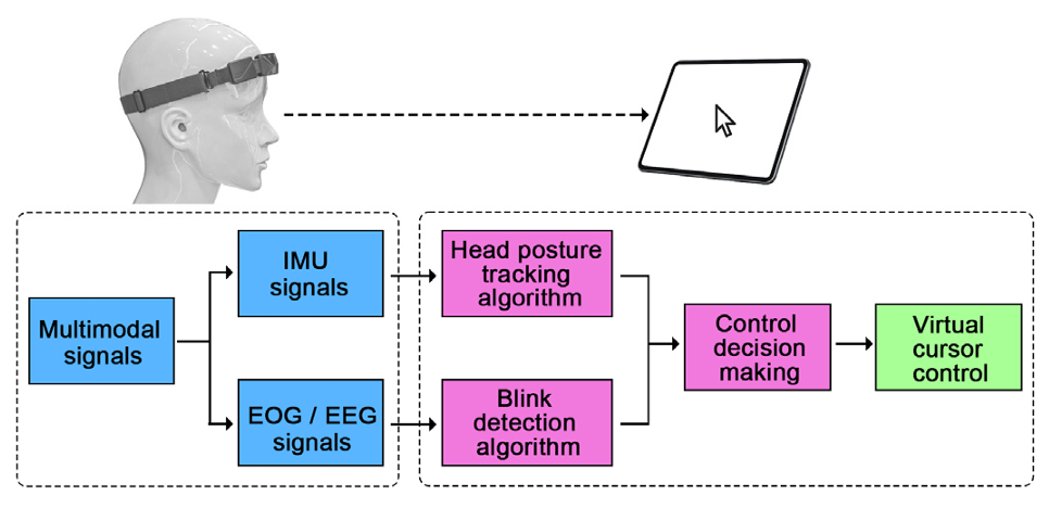 系统搭配无线可穿戴脑机接口头带,集成干电极与9轴惯性测量单元(IMU),可同步、无创采集患者的眼电(EOG)、脑电(EEG)及头部姿势信号。头带佩戴方式简单便捷,无需复杂调试,适配患者日常佩戴需求;采集的多模态信号通过蓝牙实时传输至配套平板电脑,与病房内所有智能设备形成无延迟联动,为后续精准解码与指令执行奠定坚实基础。