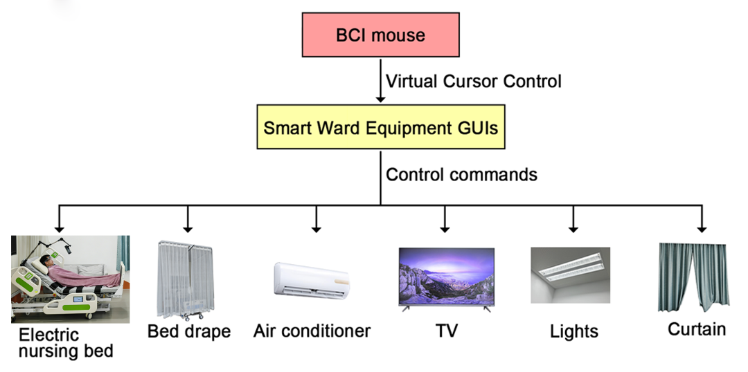 而脑机接口(BCI)系统作为整个智慧病房的核心智能枢纽,打破了传统病房设备的独立操作壁垒,可实现与电动病床、灯光、窗帘、空调、电视等多类病房设备的无缝联动。患者通过一套脑机接口控制系统,即可完成对病床姿态的连续调节,以及对病房环境设备的开关与参数调节,真正实现 “一人一控,全域掌控”,构建起一体化的智能康复护理场景。