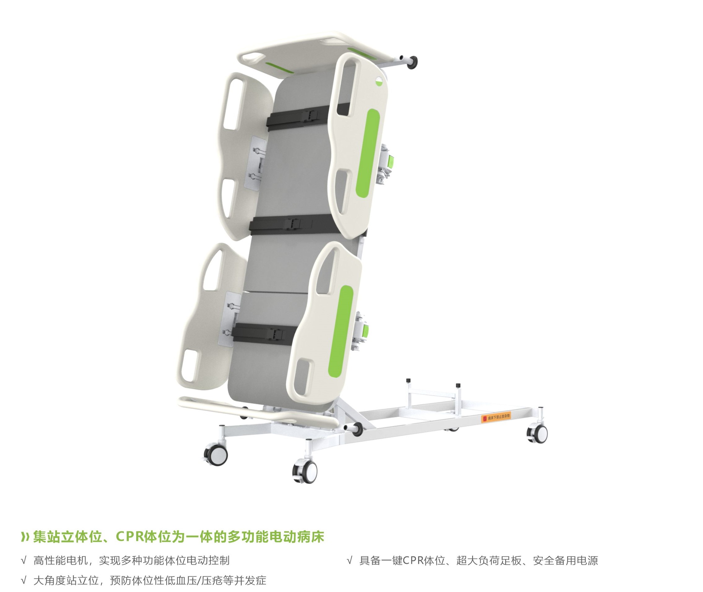 电动病床集起立床康复功能与普通病床舒适性的特点于一体,支持体位调整、站立训练,不仅能助力患者早期康复介入,还能预防因长期卧床导致的各种并发症,如肌肉萎缩,血液循环问题等,通过智能调控,提升患者生活质量和康复效率。