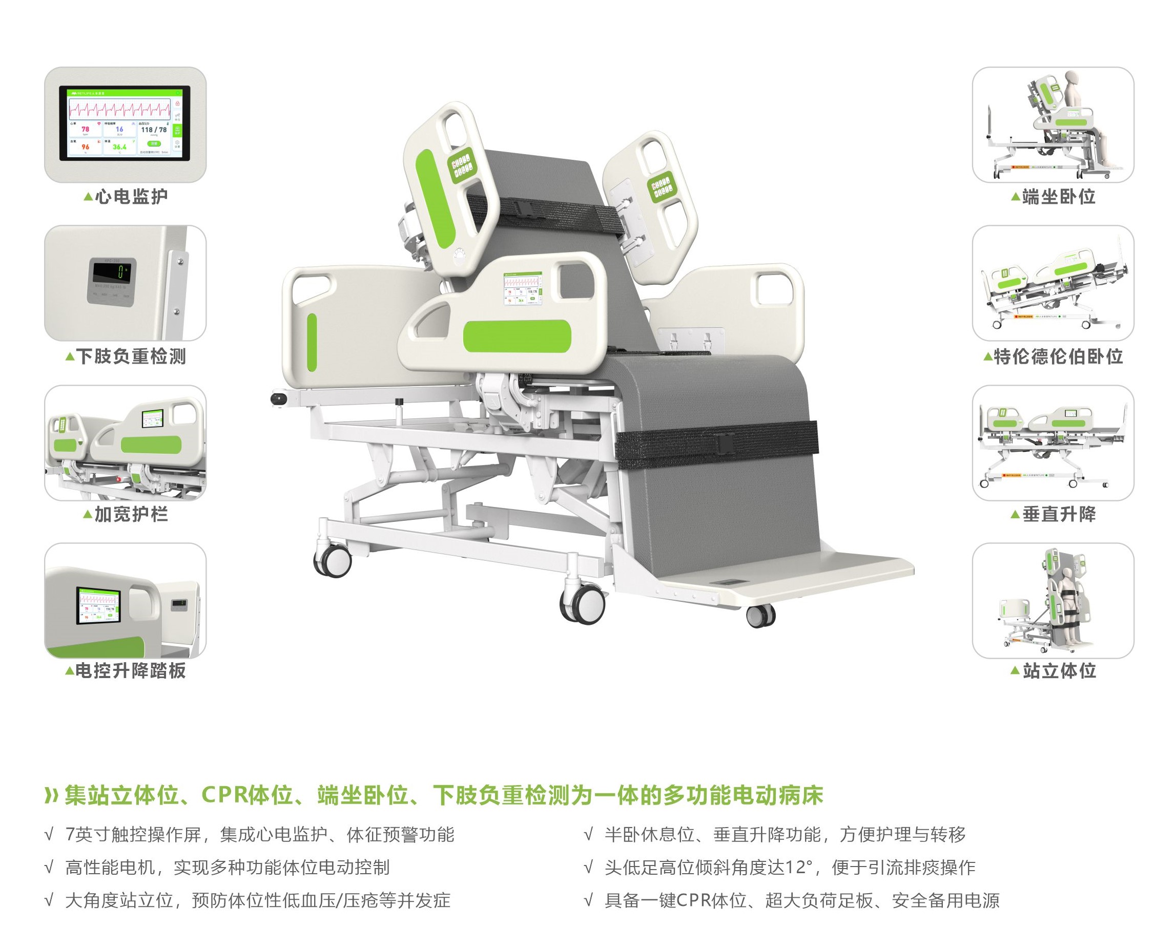 电动病床集起立床康复功能与普通病床舒适性的特点于一体,支持体位调整、站立训练,不仅能助力患者早期康复介入,还能预防因长期卧床导致的各种并发症,如肌肉萎缩,血液循环问题等,通过智能调控,提升患者生活质量和康复效率。