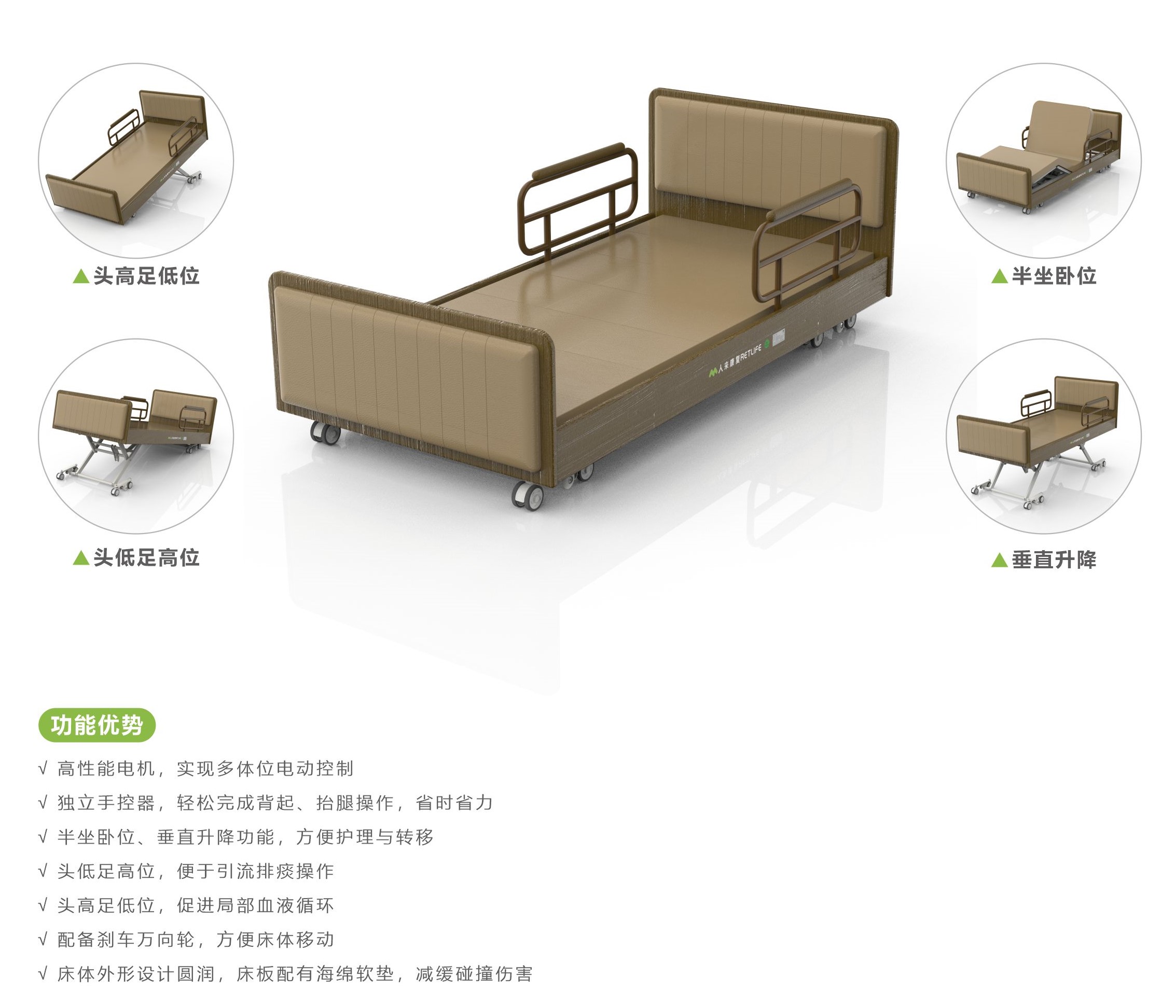 电动护理床是一款集多种功能于一体的家居康养护理设备,采用手控器一键操作,驱动电机可随意调节床架,适配人体各个部位的弯曲角度,可自由调节身体姿势,减轻颈部压力,端坐、后躺或将脚部升起以促进血液循环等,这些都极大地满足了用户的日常生活需求。
