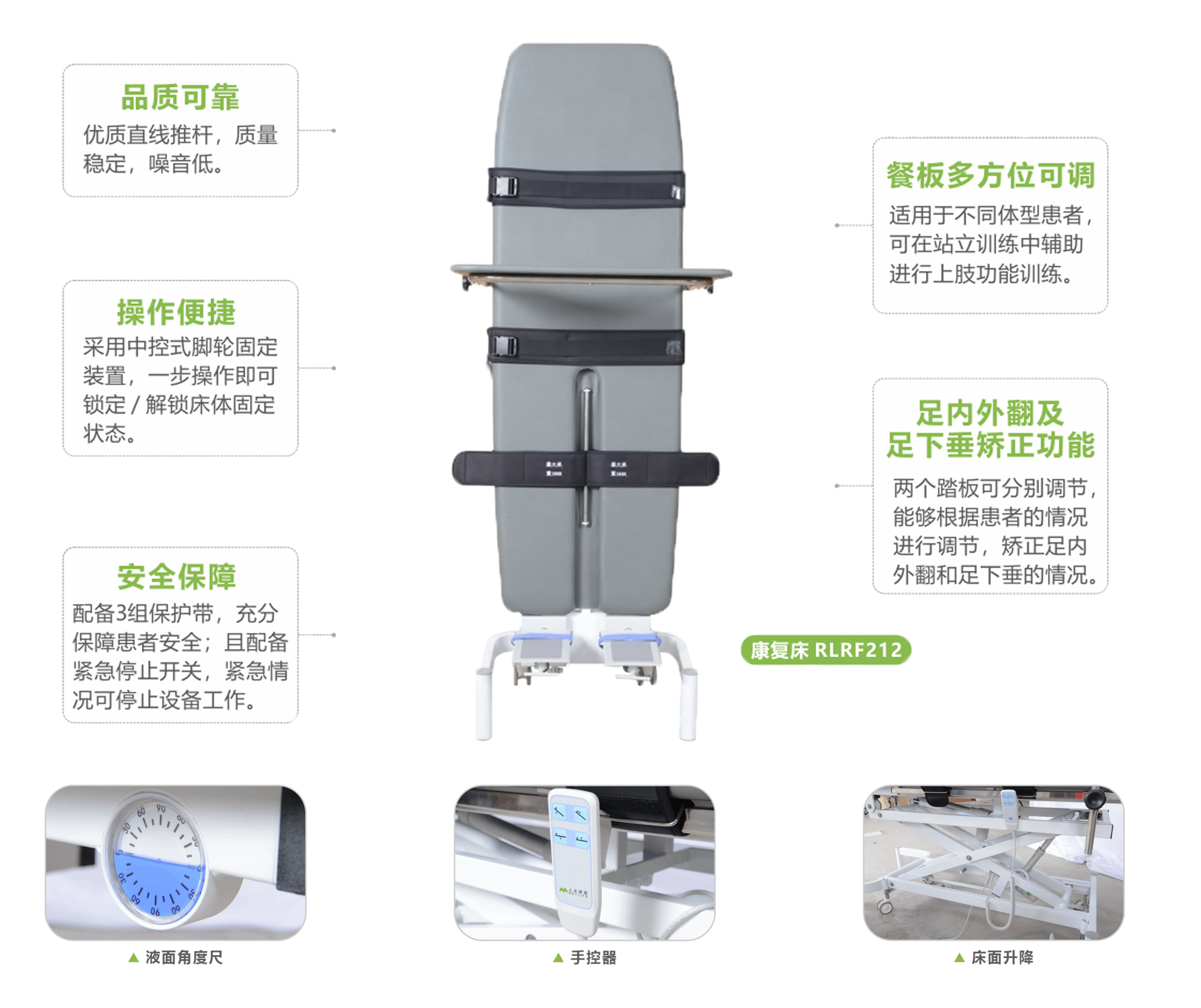 康复床(电动起立床)采用优质直线推杆,能使床面自动处于0~85度之间,利用起立功能进行站立训练,对长期卧床和脊髓损伤等患者,有预防体位性低血压、肌肉萎缩和关节僵硬等多种并发症的作用。床体可电动垂直升降,方便转移。康复床带有脚托板,可根据患者的情况调节不同的角度。