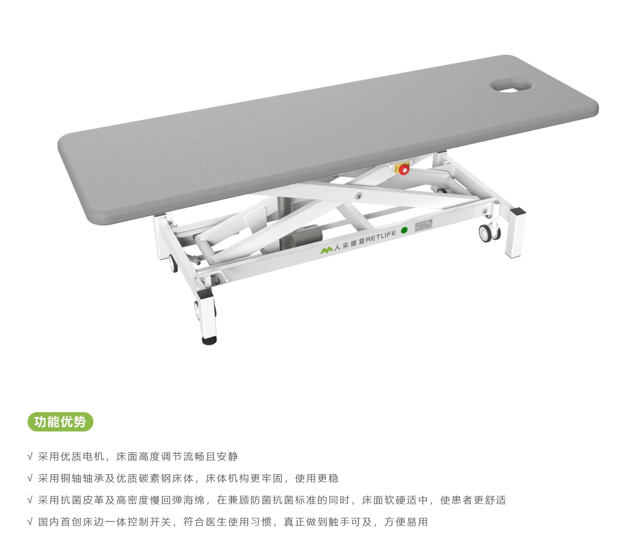 医用诊疗床(一段手法治疗床)适用于治疗师进行麦肯基诊疗法、美式整脊疗法和澳式关节松动等手法治疗时所需体位的诊断及摆放。该医用诊疗床可调整床体高度,便于治疗师的手法操作,降低治疗师的工作强度。