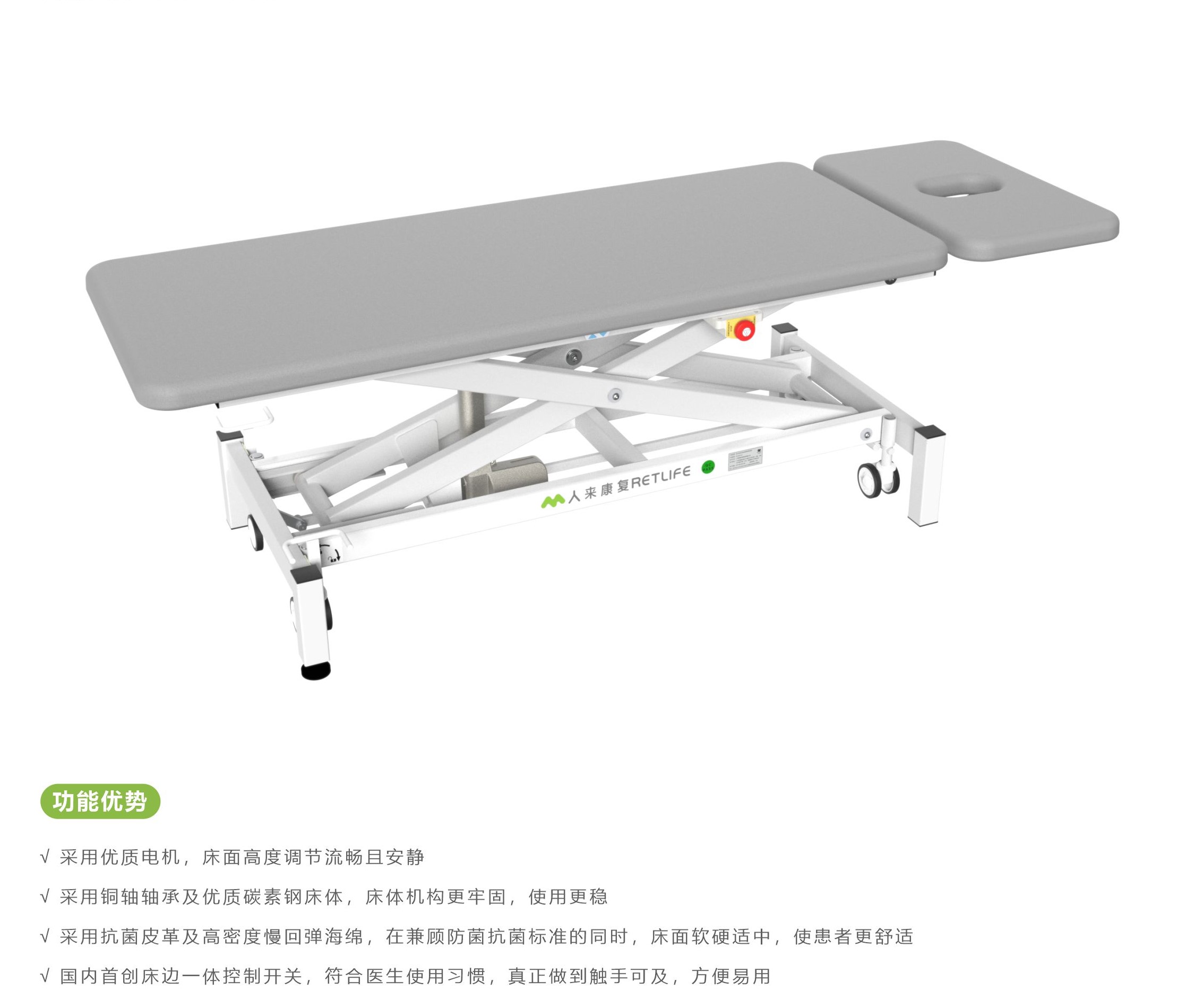 医用诊疗床(二段手法治疗床)适用于治疗师进行麦肯基诊疗法、美式整脊疗法和澳式关节松动等手法治疗时所需体位的诊断及摆放。该医用诊疗床可调整床体高度,便于治疗师的手法操作,降低治疗师的工作强度。