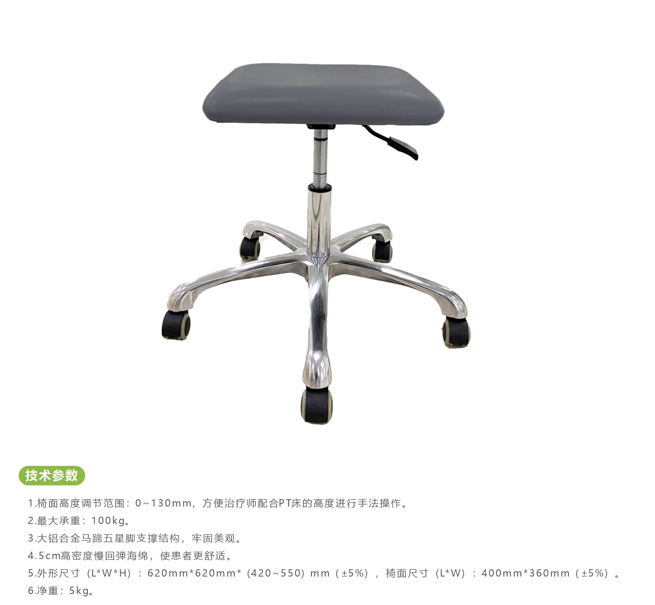 PT凳具有高度调节、位置转移和旋转等功能,方便治疗师在治疗过程中的体位转移。