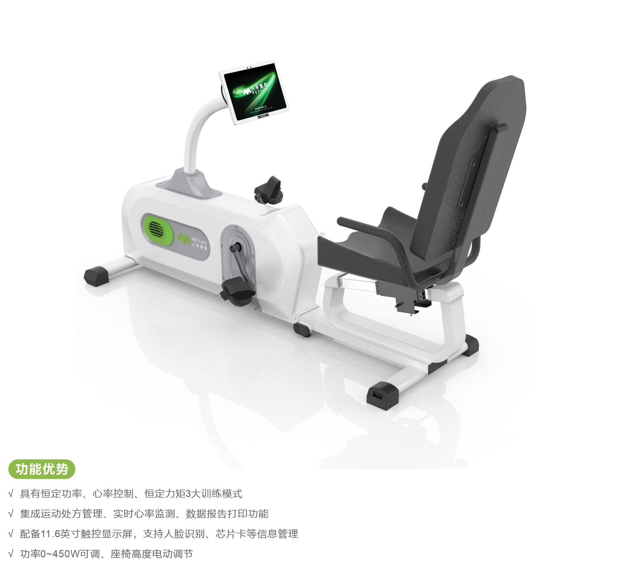 心肺耐力卧式功率车用于在卧式功率自行车上进行心肺功能训练、功率控制训练、心率控制训练、阻力控制训练,从而辅助用户进行更为有效的康复训练以及心肺强化训练。