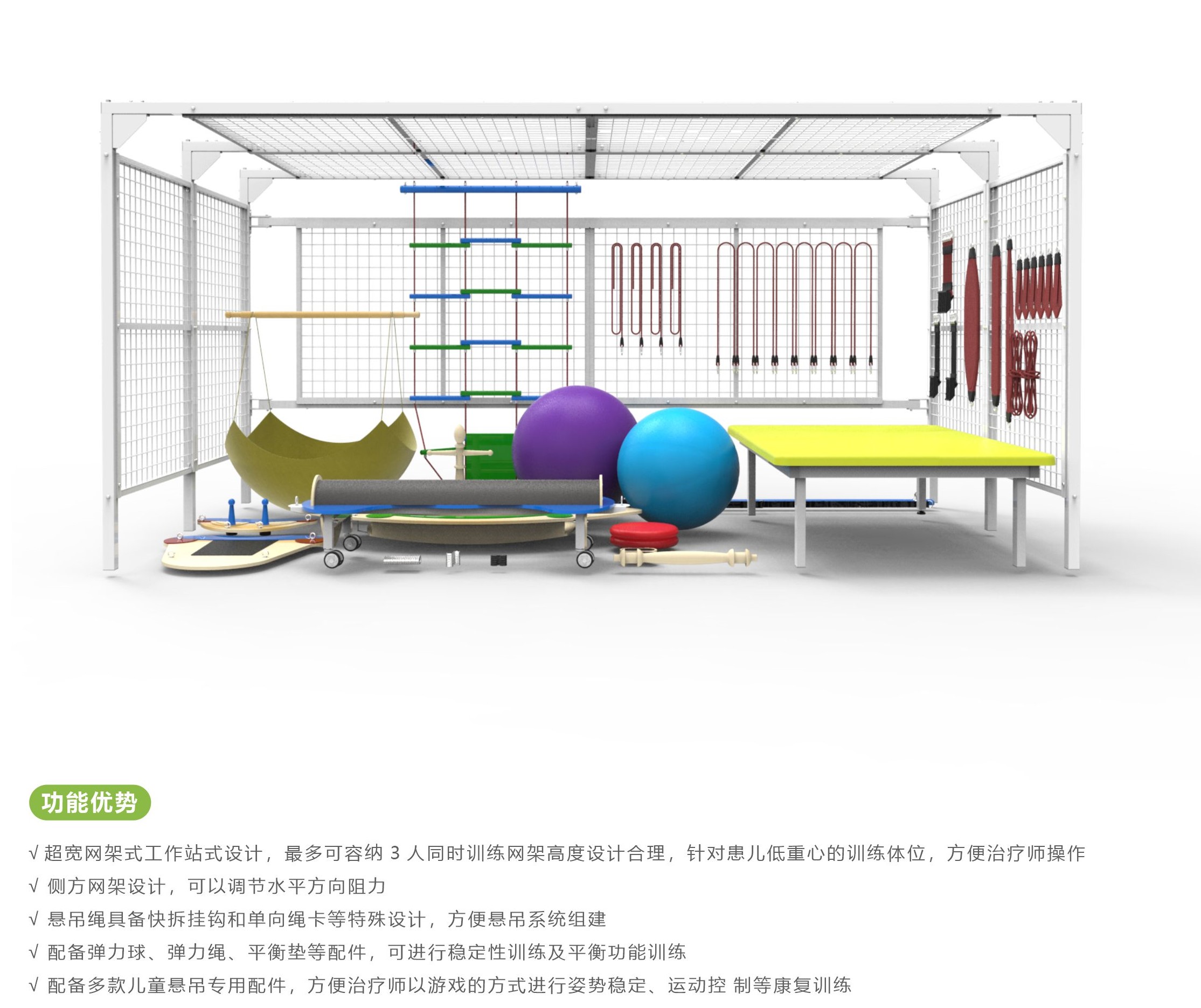 儿童悬吊训练系统是从儿童生长发育规律出发,通过多种悬吊训练配件,以闭链运动为基础,在不稳定状态下激活或强化患儿核心肌群及神经肌肉控制系统,重塑正常的神经肌肉控制模式。这种以主动性、娱乐性和互动性为特征的训练系统,是对传统儿童康复的补充。