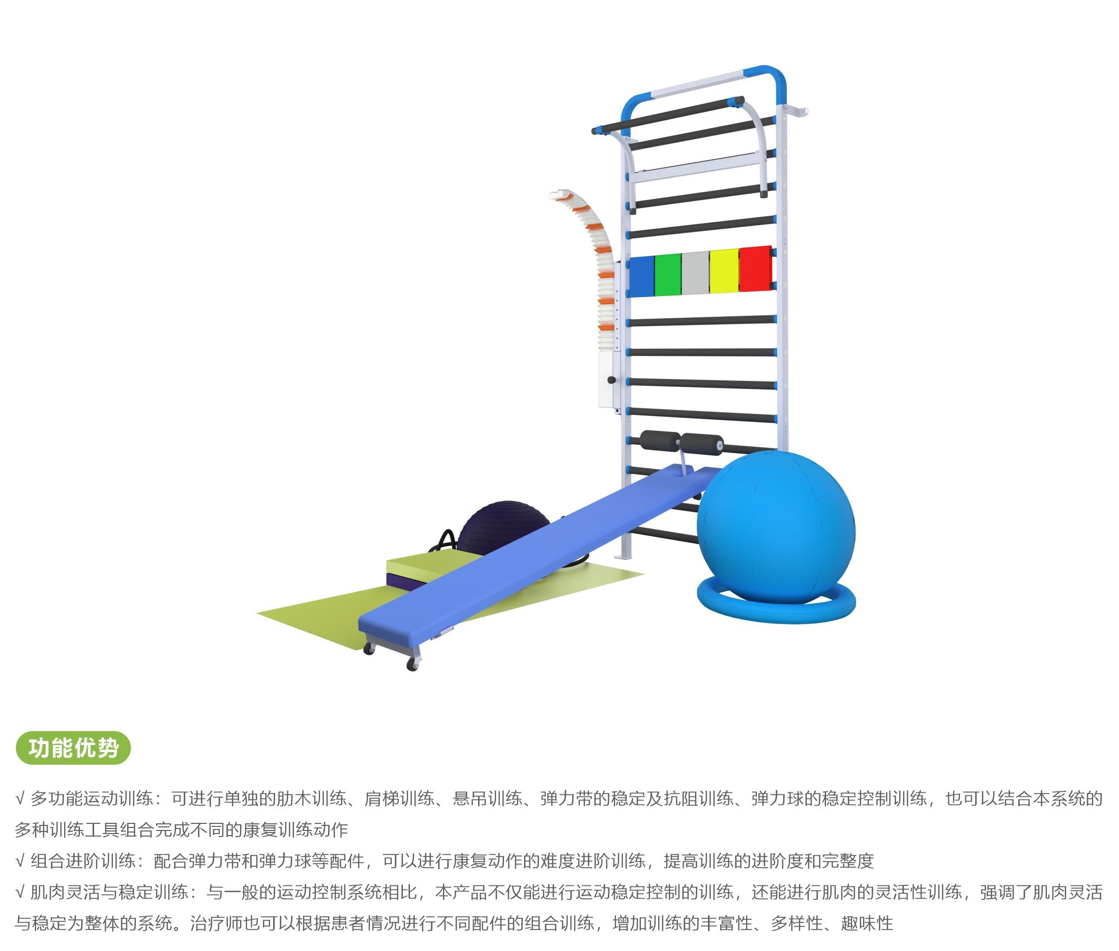 肩梯肋木是一套专业的多功能组合运动控制系统。利用肋木、悬吊架、肩梯等设备,辅以弹力球、弹力带配件,可以完成针对青少年、运动损伤、脑卒中后遗症患者进行柔韧训练、姿势控制训练、关节稳定性训练、全身的运动控制训练等。该系统扩展度高,治疗师可根据需求创造出多种多样的训练动作,可以使日常功能训练充满乐趣。