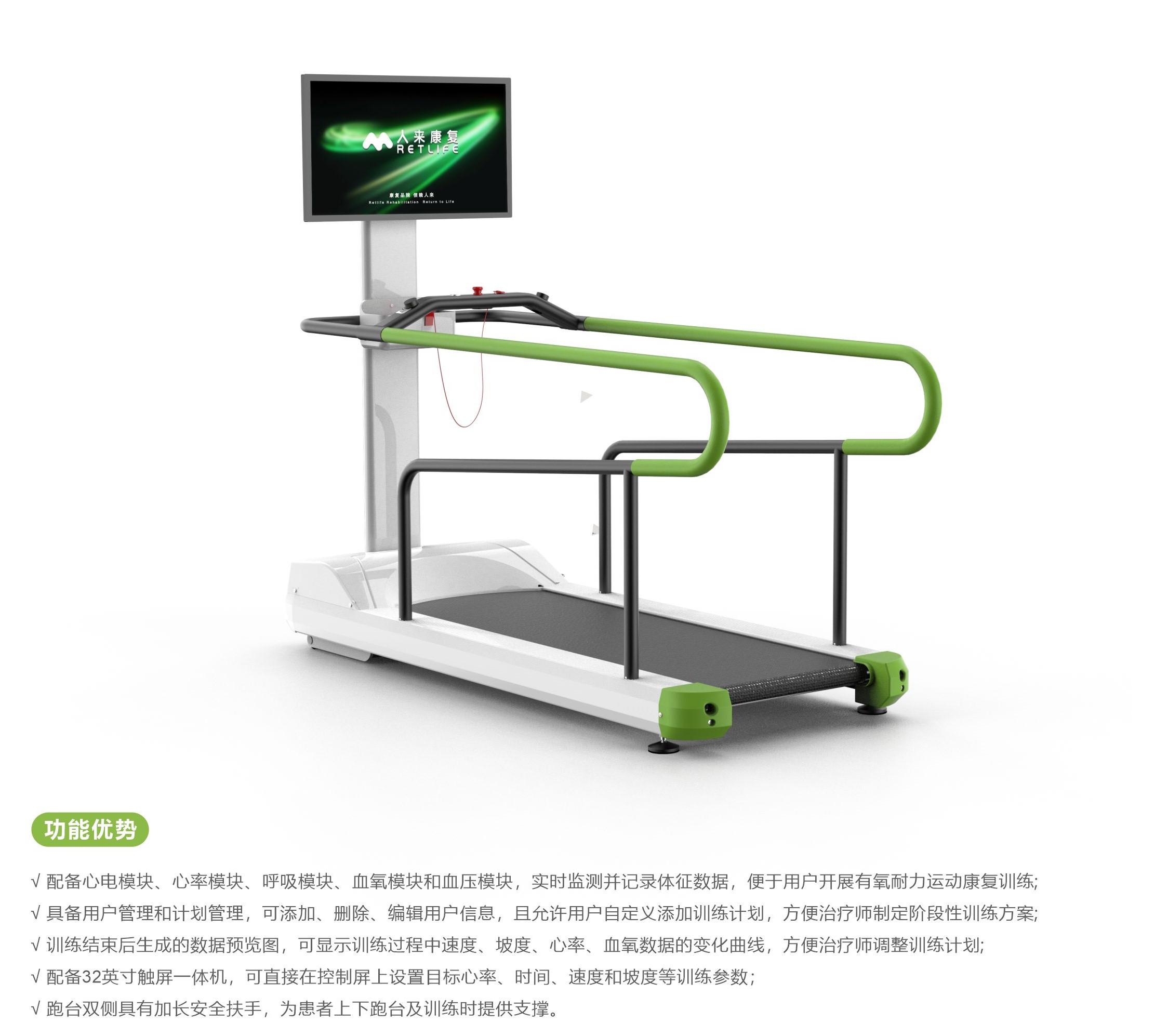 康复跑台训练系统是用于在运动平板上进行心肺有氧耐力训练、步行康复训练、训练前后的热身及冷身运动。本系统可采集用户的体征数据,对用户各个训练时段的体征数据进行监测并记录,通过对数据的处理得出用户的训练效果变化趋势,从而辅助用户进行更为有效的运动康复训练。