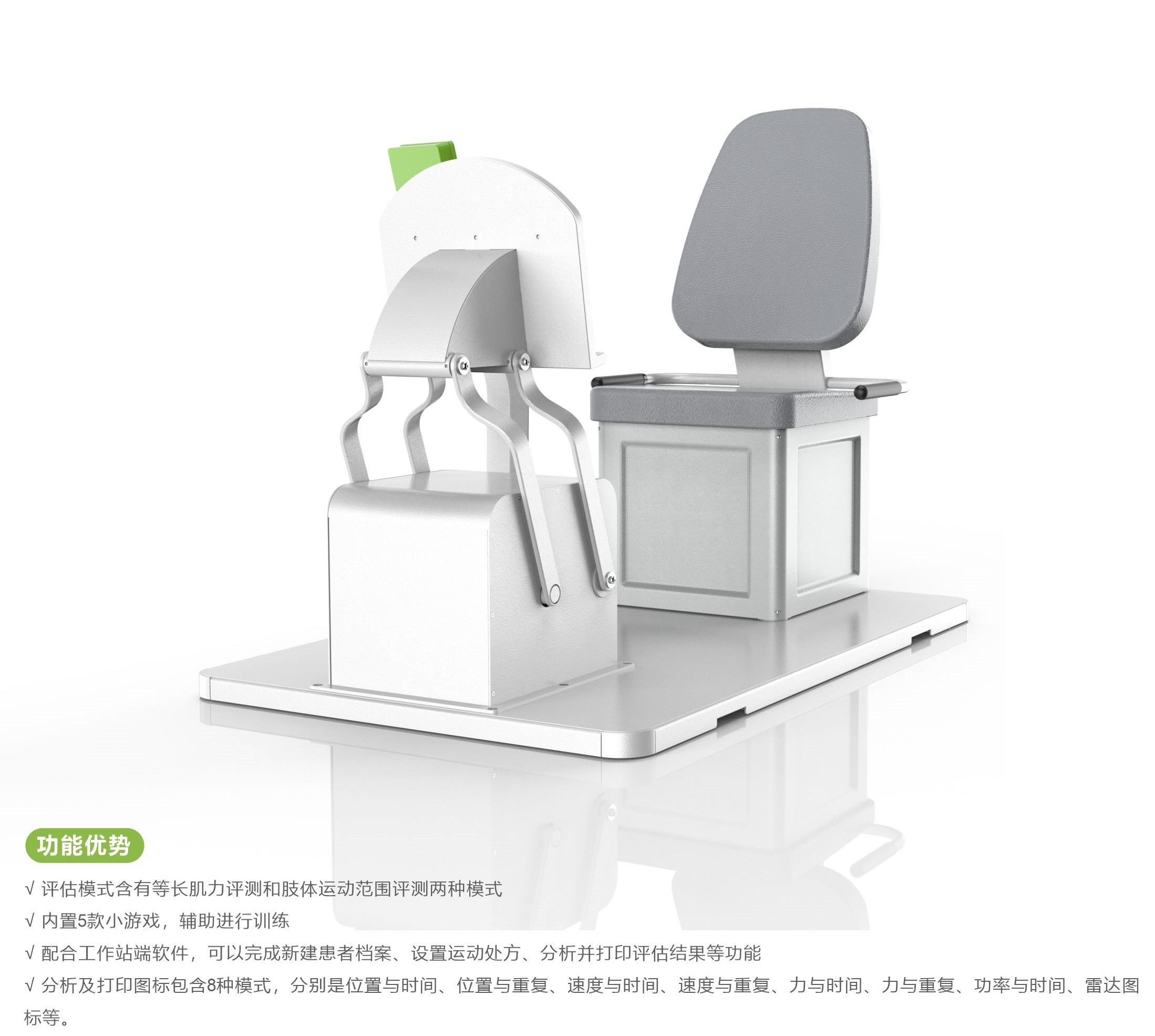 肌力评估与运动反馈训练系统是一套基于医学训练疗法而设计的主动运动训练系统,医生或治疗师经过科学评估后为患者制定系统化的康复目标及训练计划,然后指导患者脱离治疗师自主完成运动训练。该产品配备的软件系统由工作站端及设备终端两部分构成,评估结果可输出报告。