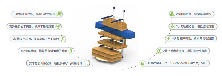 全地形模拟步行训练系统是一套以模拟不同地形、提高本体感觉输入,训练患者步行功能的系统。拥有多种地形模拟配件,通过不同拼接组合,根据患者自身下肢支撑及迈步等步行能力情况可以进行平衡协调训练、步态训练、模拟障碍物步行训练等,帮助患者回归社会(家庭)生活。