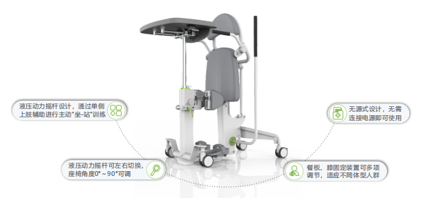 站立架是一款用于辅助无法正常站立的患者进行站立训练的康复器具。患者在液压动力帮助下从坐位转变到站立位,并恰好处于站立架上的预定人体空间位置,用固定装置对人体加以固定,使患者稳定保持在站立位。