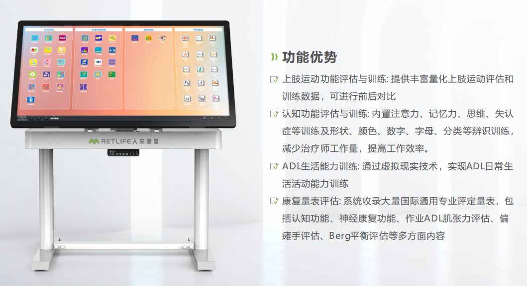 数字OT训练与评估系统采用最新的全屏触控互动技术,融合最新的虚拟现实技术和人机情景互动技术,整合多种常用评估量表和训练手段,针对因神经损伤导致的上肢运动功能障碍及脑功能认知障碍进行精确地康复评估与训练,系统自动分析,自动生成报告,治疗师可以随时掌握病人的康复进程,制定治疗方案,可以有效减轻医疗者的工作量,加快患者的功能恢复。