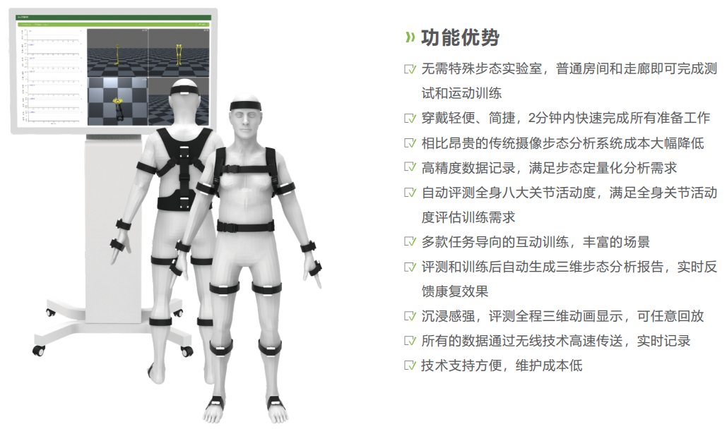 三维步态分析与训练系统采用先进的无线穿戴式位置传感器,具有高精度,全自动采集和分析的特点,能够满足患者全身关节评测、步态分析、临床报告 、步态数据记录和实时步态动画分析等功能。通过步态分析和检查,也有助于下肢神经肌肉、关节疾患的诊断、观察康复医疗措施的效果。